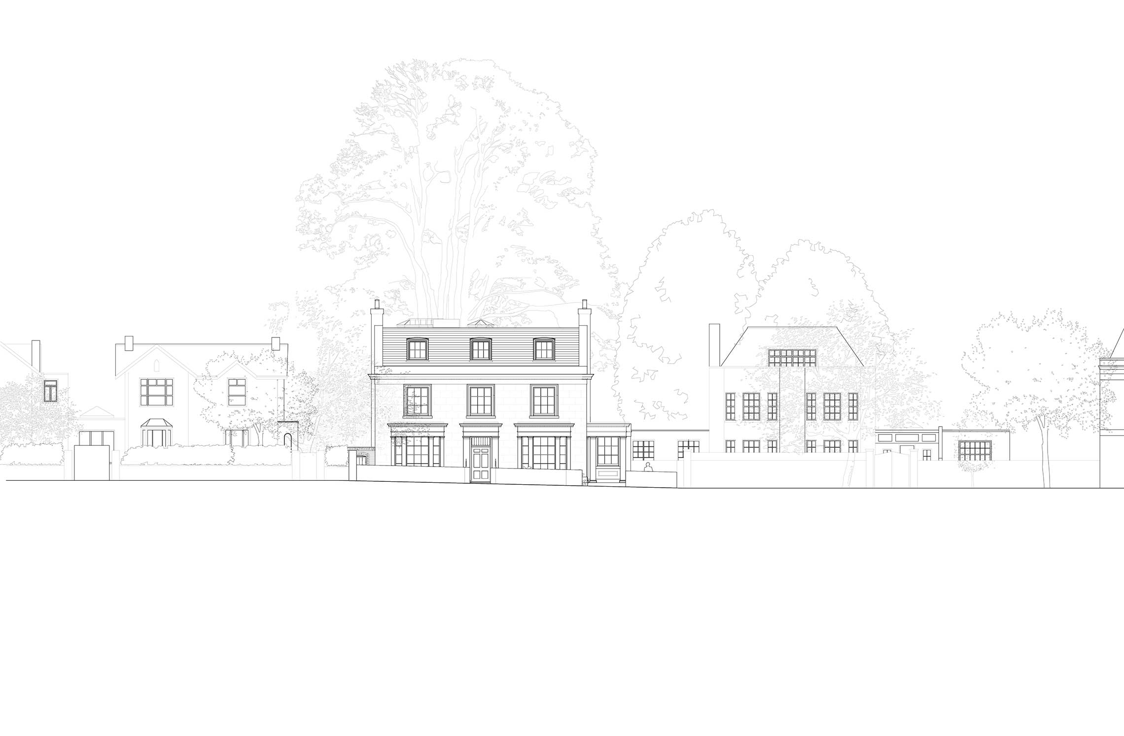 The client was seeking a house that built upon this approved scheme, yet would appear to be completely and convincingly traditional within the street scene. We developed a proposal for a severe, restrained façade in the Greek revival style. Windows were overscaled to help reduce the visual appearance of the building, and very careful use of simple detailing applied to create a design that belongs to the local idiom of the Eyre Estate.