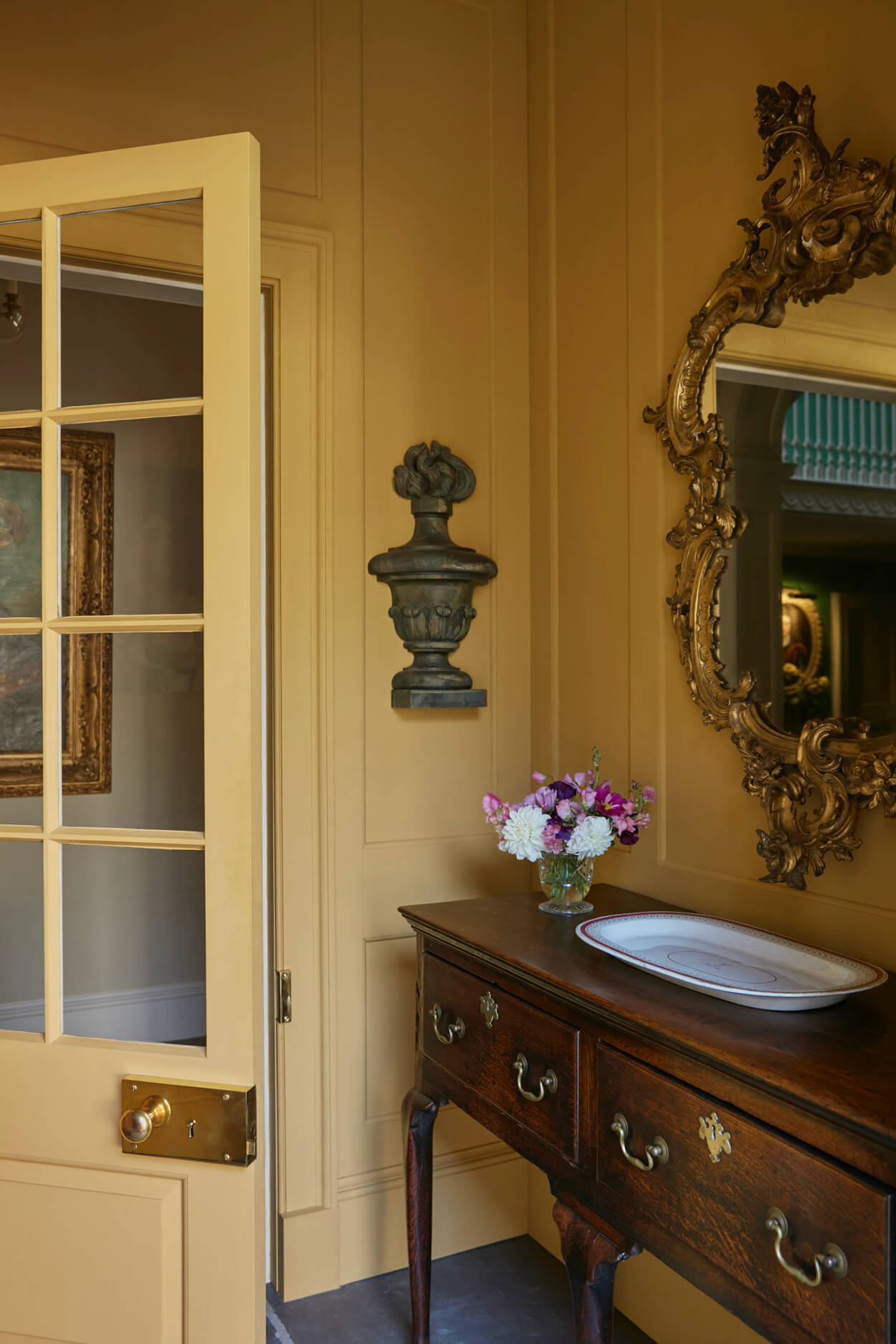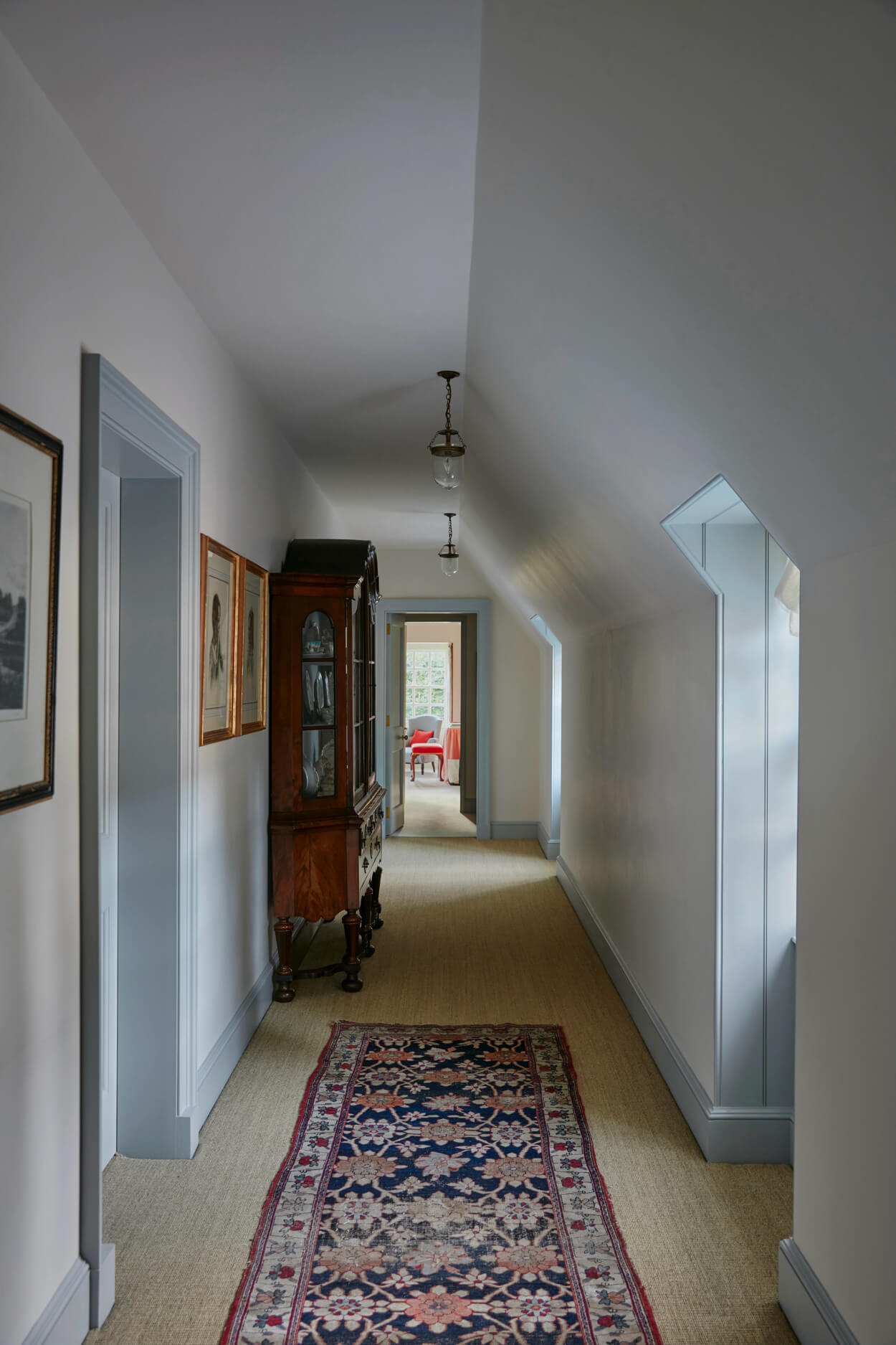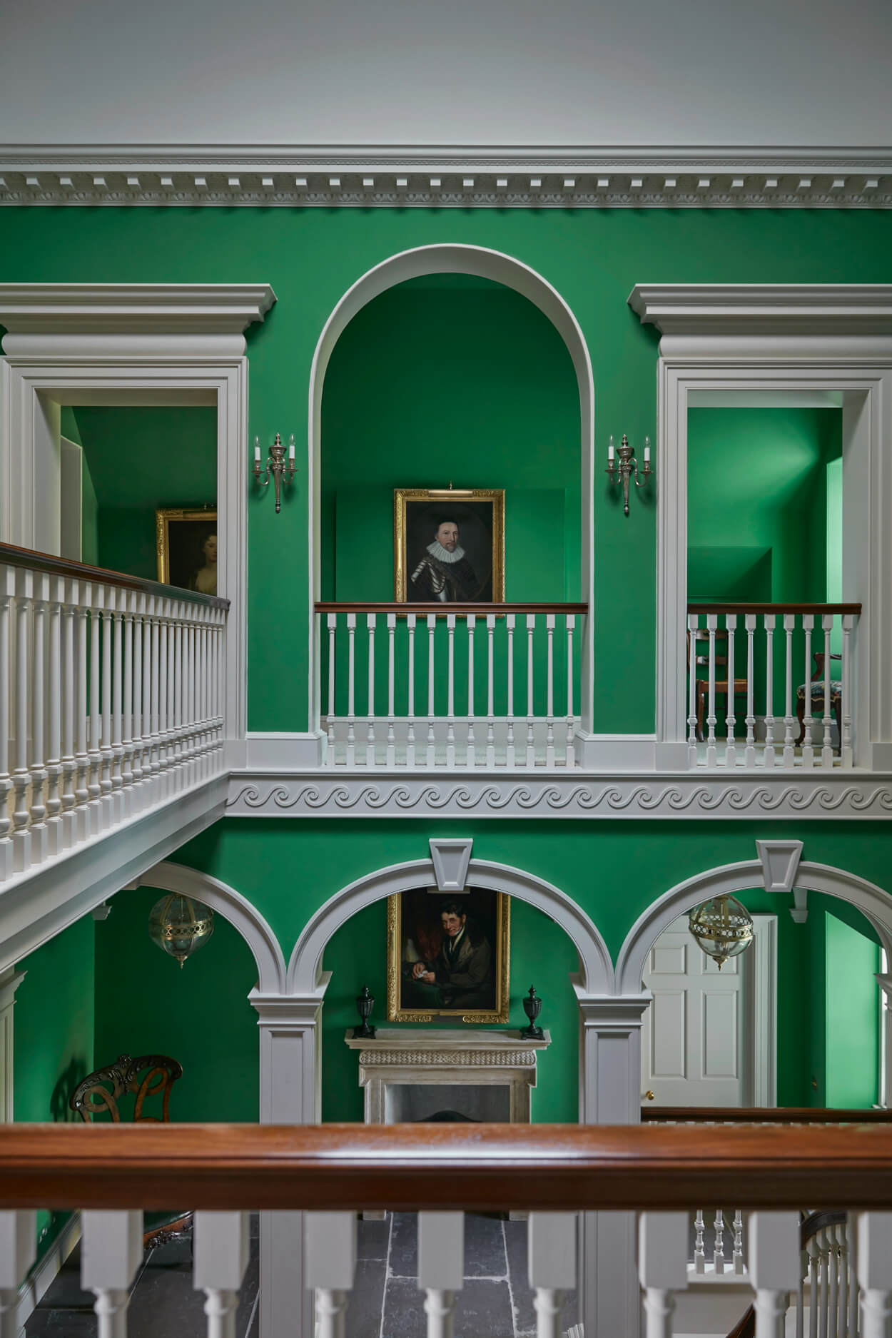 The entire interior was reconstructed in a careful and measured approach to create a fine new sequence of spaces. A panelled, double-height hall leads to a completely new early-Georgian styled staircase and Regency oak library. Extensive new kitchen and pantry joinery was designed and detailed by the firm.