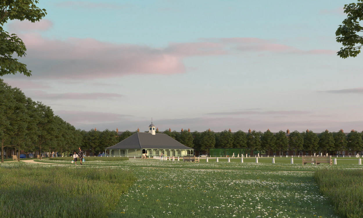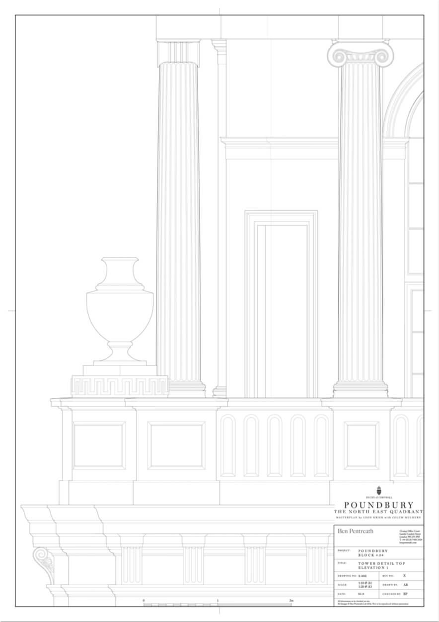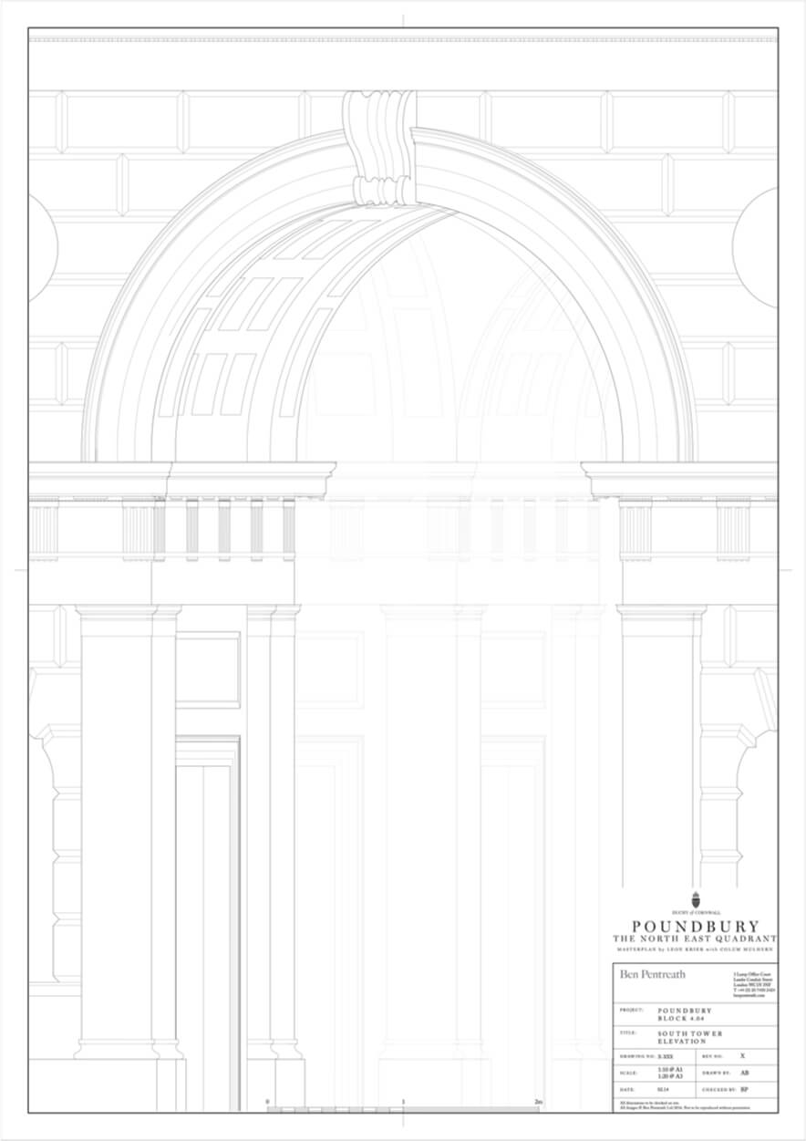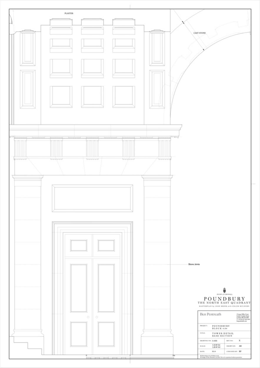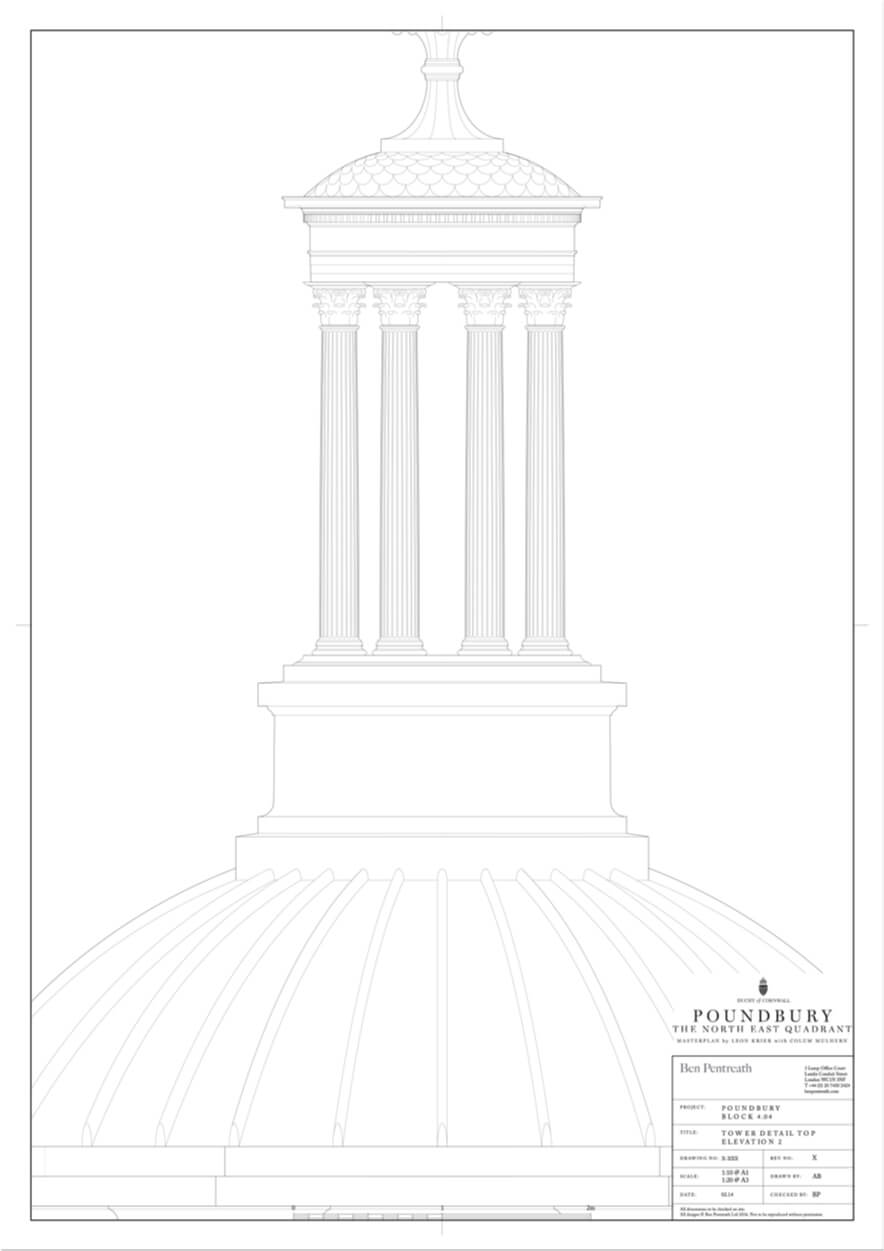 Royal Pavilion is the focal building in the Duchy of Cornwall’s Poundbury development, masterplanned by Leon Krier. At the centre of the scheme, Krier envisioned a bold new urban square lined with taller buildings, and, on the northern side – with extensive views over the Dorset countryside, a city-scaled Pavilion with a tall tower at the focus point of several major streets.