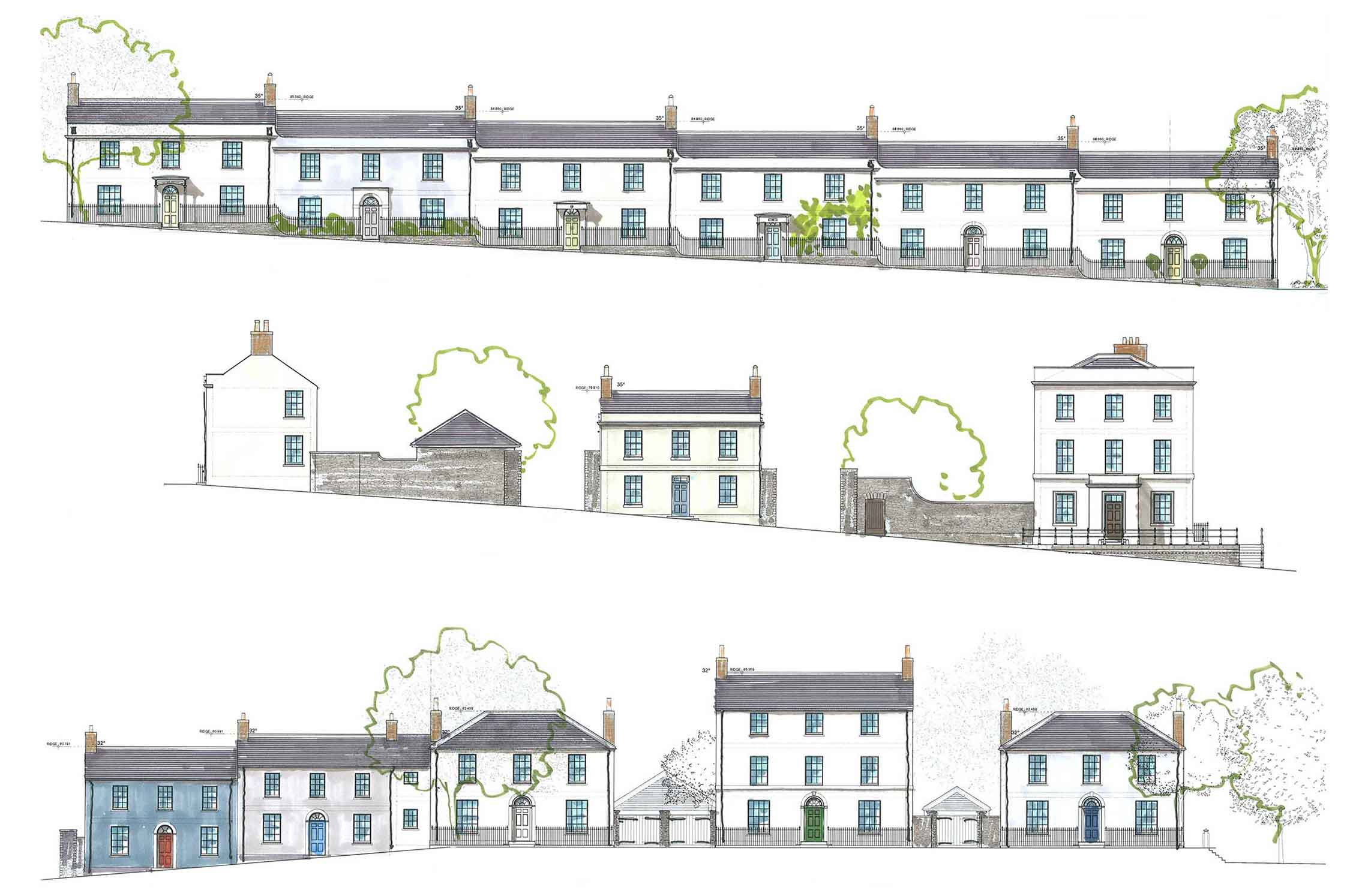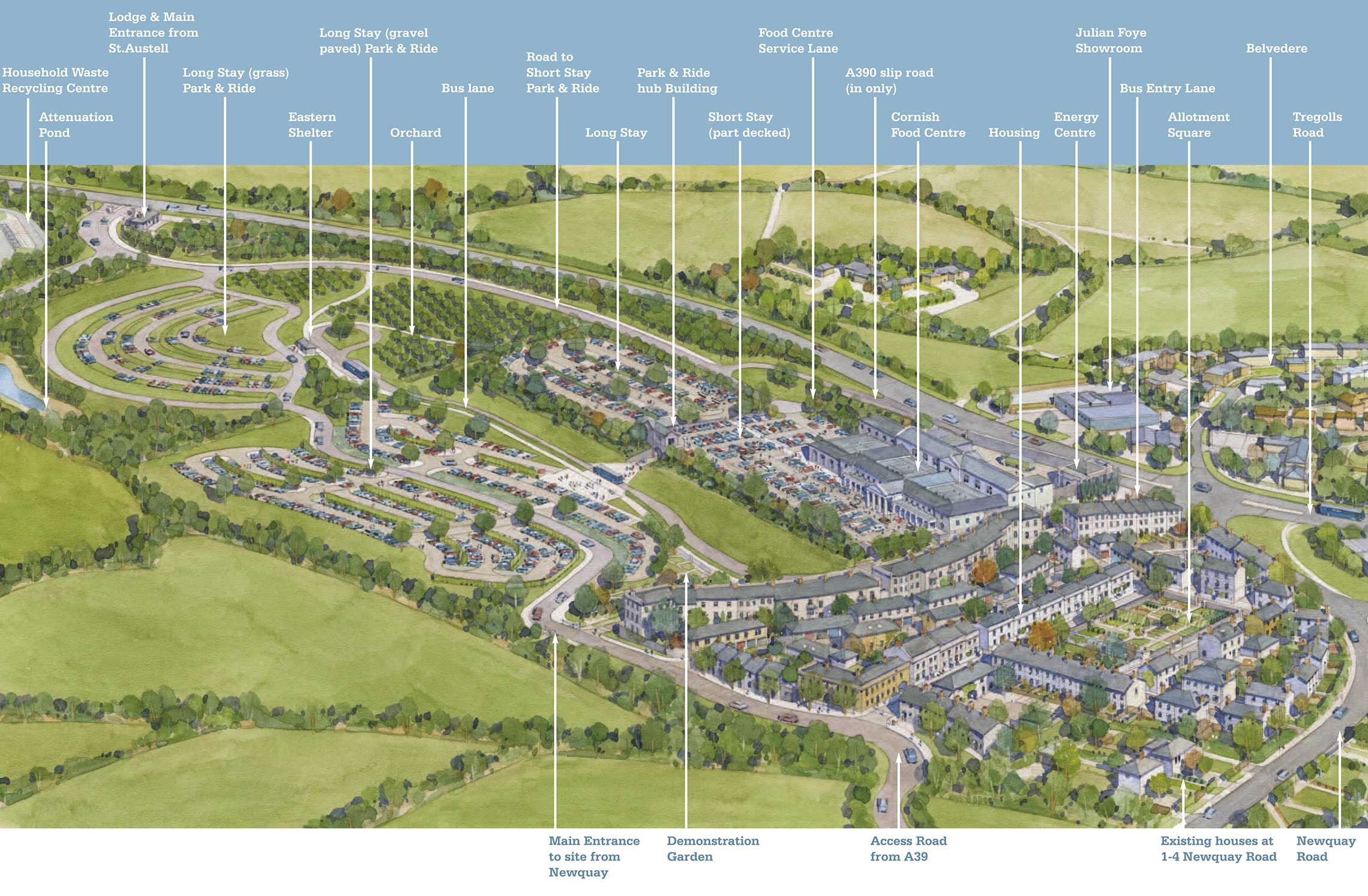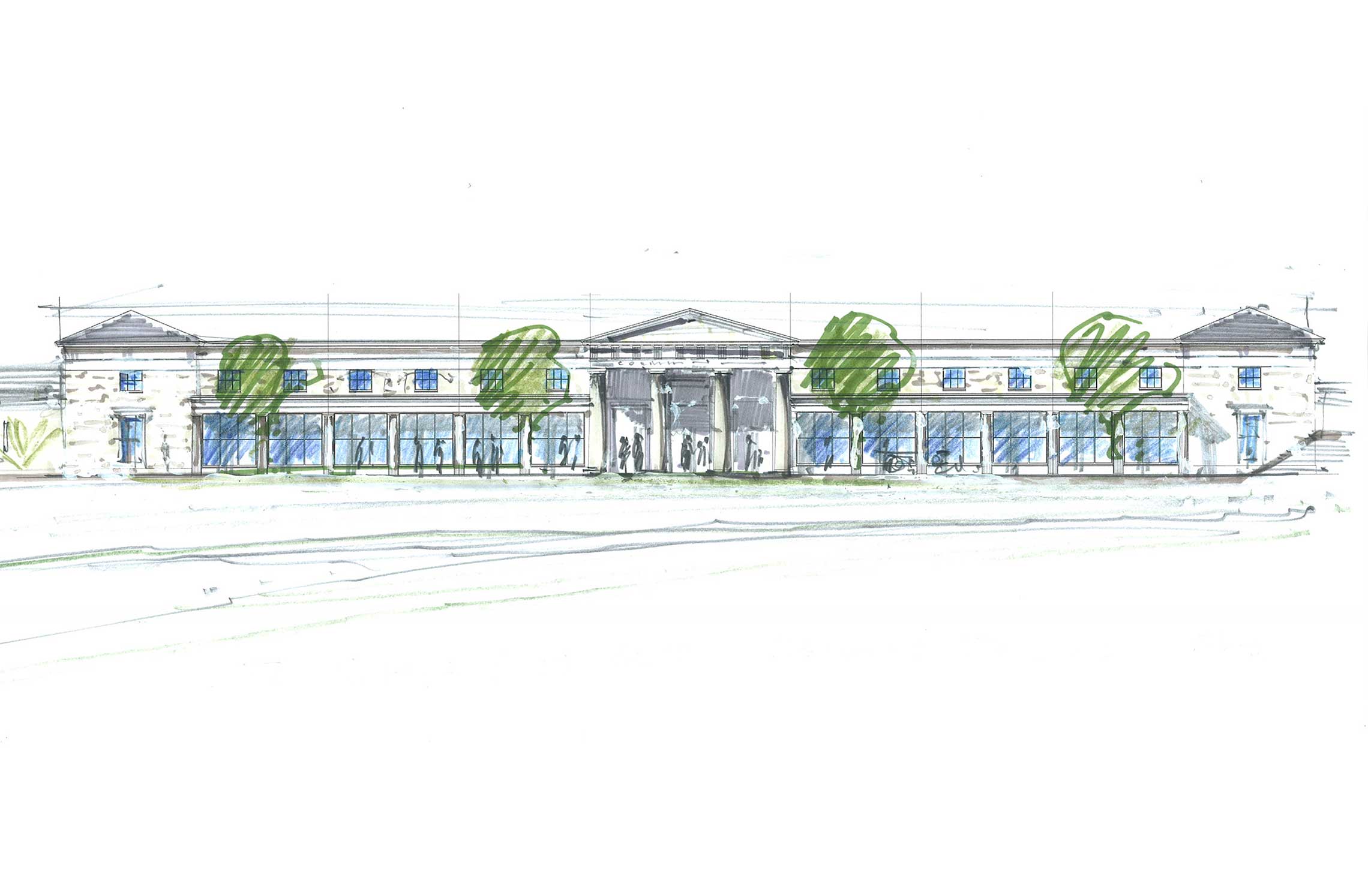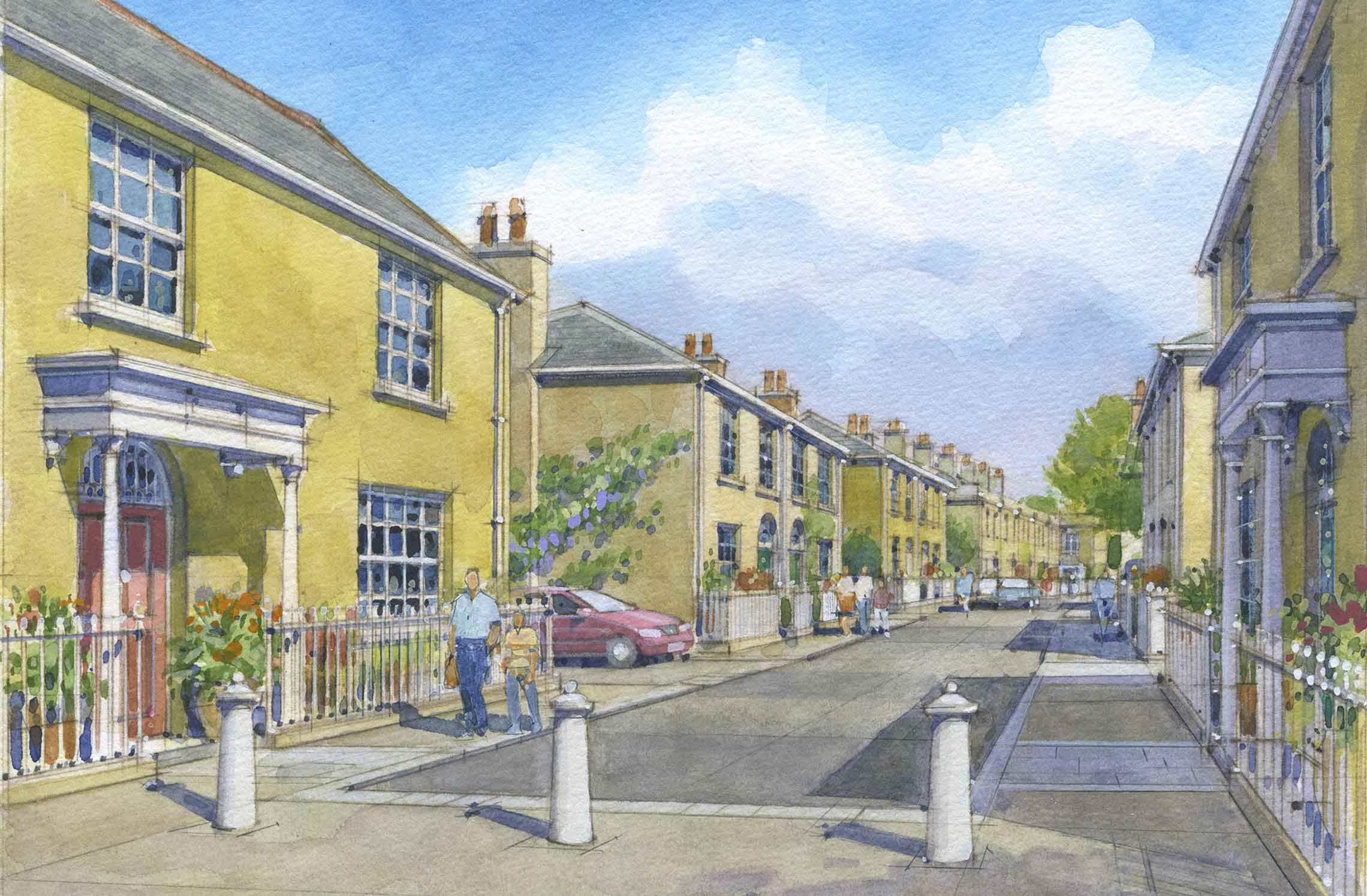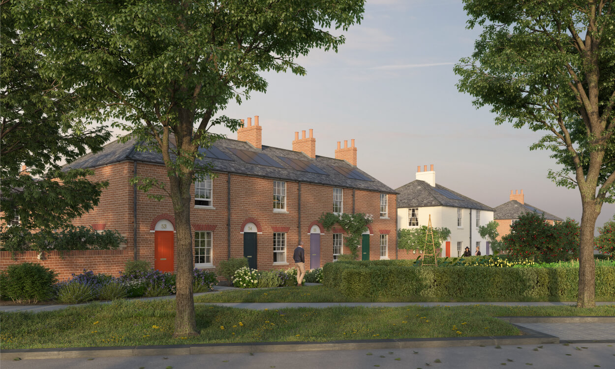 Royal Pavilion is the focal building in the Duchy of Cornwall’s Poundbury development, masterplanned by Leon Krier. At the centre of the scheme, Krier envisioned a bold new urban square lined with taller buildings, and, on the northern side – with extensive views over the Dorset countryside, a city-scaled Pavilion with a tall tower at the focus point of several major streets.