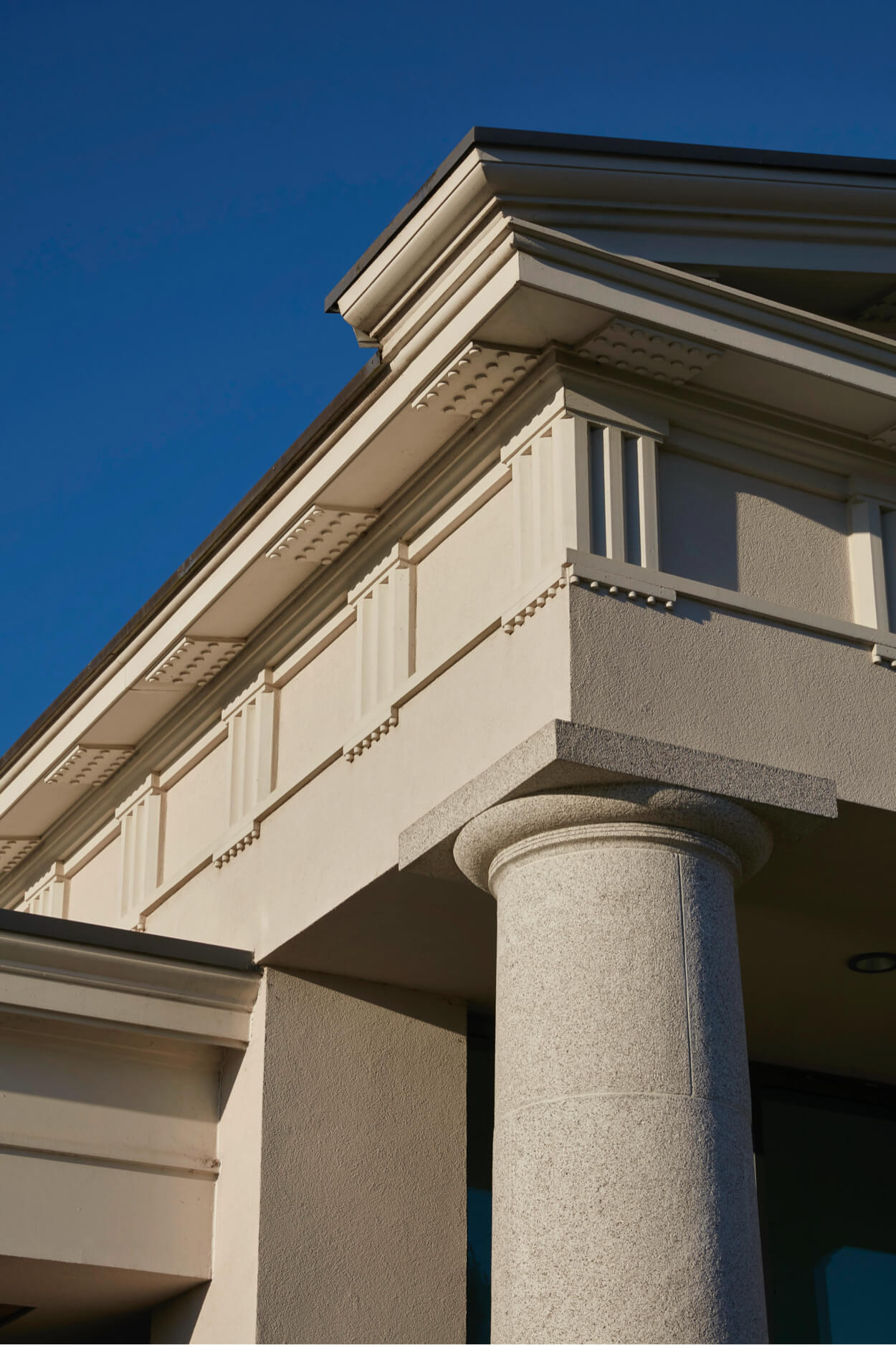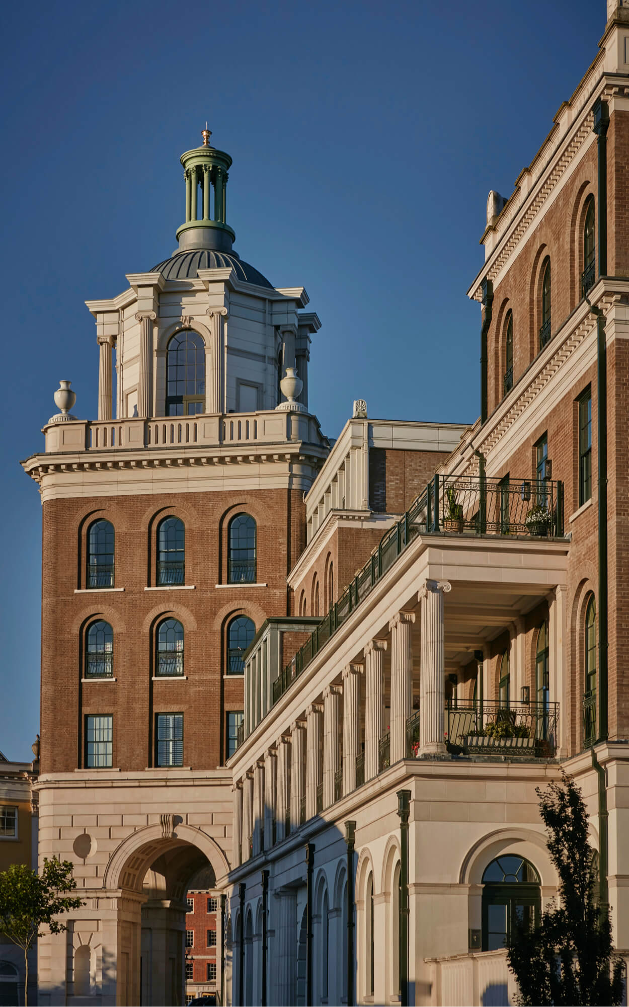 The building is designed with echoes of architecture by John Nash, and Sir John Soane, combining Greek Revival forms and details with Roman arcaded architecture. The tower rests on a giant arched base in reconstructed stone. The building is of brick with restrained classical detailing. Every apartment is designed with extensive outdoor terraces and as a result the building has a series of colonnades on each elevation. The interiors have been designed by Ben Pentreath and can be viewed here.